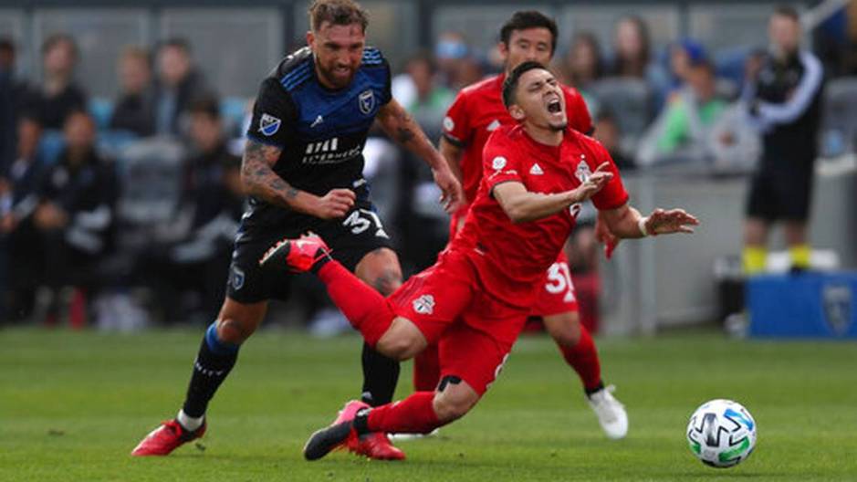 photo from centredaily.com: San Jose Earthquakes’ Guram Kashia (37) Toronto FC’s fouls Marky Delgado (8) during the second half of an MLS soccer game in San Jose, Calif., Saturday, Feb. 29, 2020.