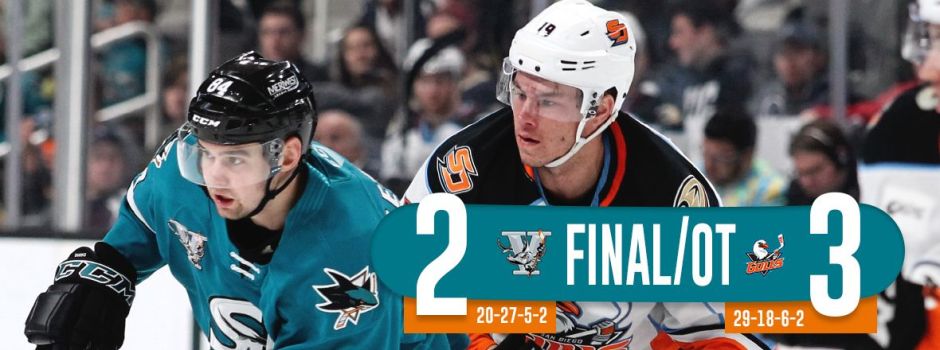SAN JOSE, Calif- The San Diego Gulls flipped the script in their favor a night after the San Jose Barracuda came back from a two-goal deficit. This time around they would have the last laugh as Isac Lunderstrom scored the game winning goal with three seconds left in overtime to complete a 3-2 come from behind victory for the Gulls on Saturday evening at SAP Center.