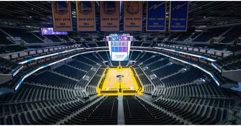 photo from narcity.com: Chase Center sits empty in San Francisco during the NBA Coronavirus epidemic all operations ceased since March 12th