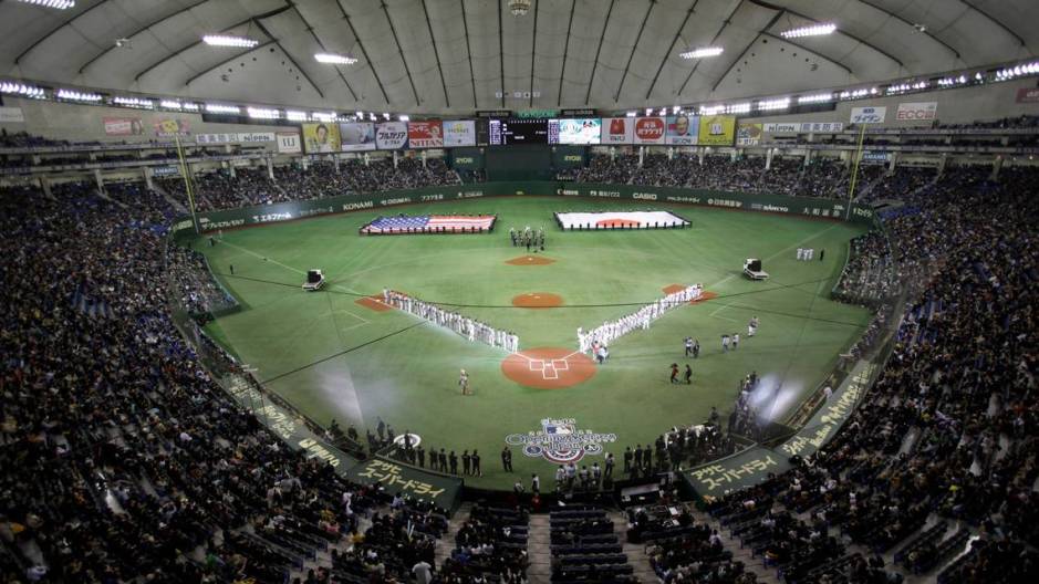 March 28, 2012 photo shows both the Seattle Mariners and Oakland A’s standing for the US and Japanese national anthems at the Tokyo Dome on opening day 2012 (AP photo)