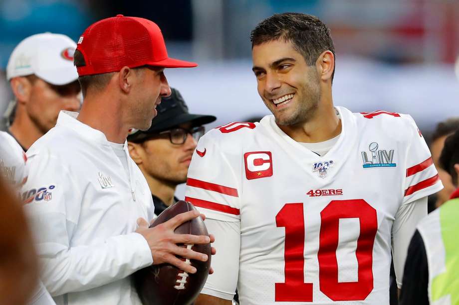 photo from sfgate.com: San Francisco 49ers quarterback Jimmy Garoppolo (10) confers with 49ers head coach Kyle Shananhan during Super Bowl LIV on Feb 2, 2020 at Hard Rock Stadium in Miami