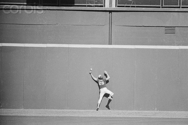 Oakland A’s left fielder Joe Rudi makes an ice cream cone catch in the webbing of his glove for a spectacular defensive play in the 1972 World Series (file photo from pinterest.com)