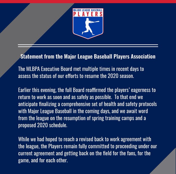Statement from the Players Association saying their prepared to get back to work July 24th. The players will be getting their full prorated pay. The season will last for two months and a week prior to the post season starting in October (MLB Players Association image)