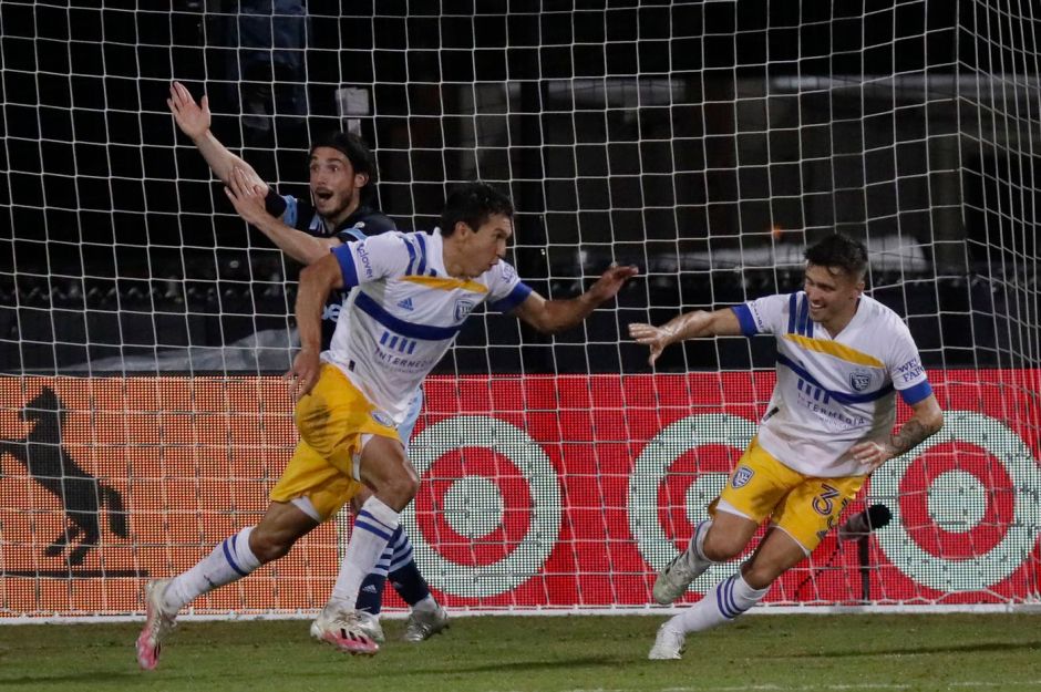 The San Jose Earthquakes Shea Salinas (left) celebrates after scoring in the eight minute of stoppage time in the second half on Wednesday night scoring the winning goal for a 4-3 win over the Vancouver Whitecaps in Orlando (AP photo)