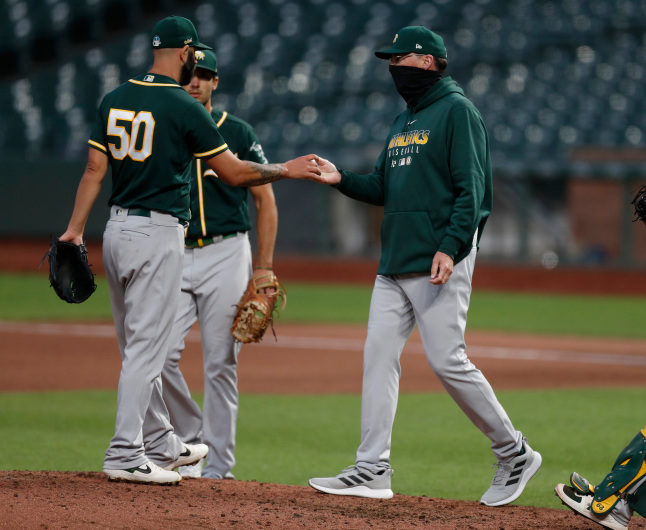Oakland A’s manager Bob Melvin pulls Mike Fiers in the fourth inning of Tuesday night’s game against the San Francisco Giants at Oracle Park the final pre season game for 2020 (mercurynews.com photo)