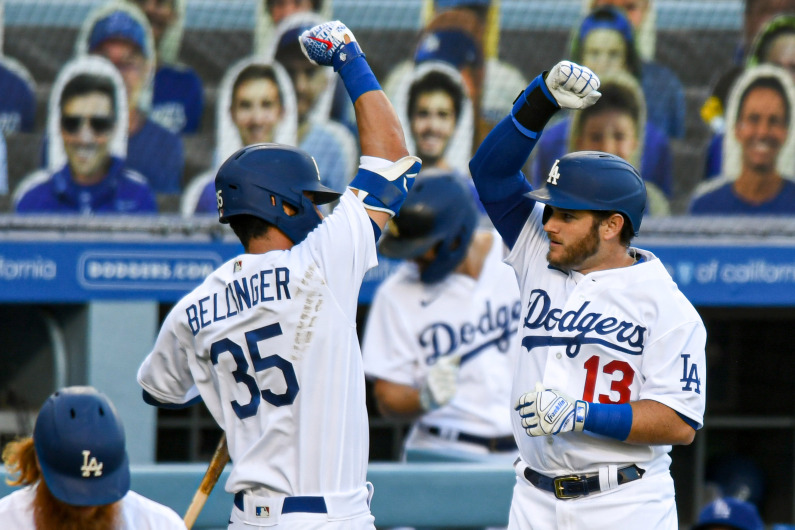 Dodgers Max Muncy, #13, celebrates his homers with Cody Bellinger, #35, with an elbow tap during first inning action against the SF Giants at Dodger Stadium Friday, July 24, 2020. (Photo by David Crane, Los Angeles Daily News/SCNG)