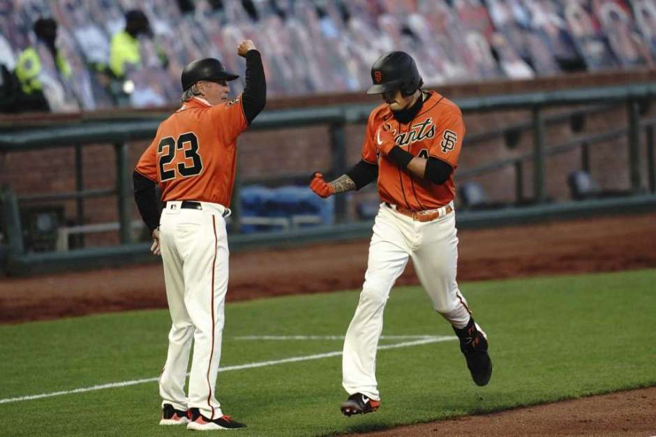 The San Francisco Giants Wilmer Flores is congratulated by Giants third base coach Ron Wotus in the fifth inning on Friday night at Oracle Park in San Francisco (sfgate.com photo)