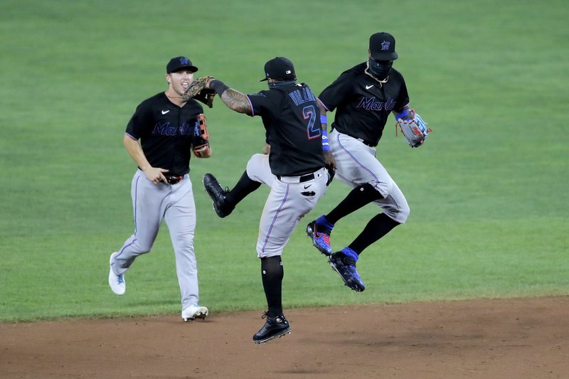 Miami Marlins shortstop Jonathan Villar (2) and center fielder Monte Harrison, right, celebrate after defeating the Baltimore Orioles 2-1 in the second game of a doubleheader, Wednesday, Aug. 5, 2020, in Baltimore. Marlins’ Corey Dickerson, left, looks on. (AP Photo/Julio Cortez)