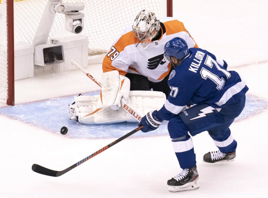 Philadelphia Flyers goaltender Carter Hart (79) makes a save on Tampa Bay Lightning left wing Alex Killorn (17) during the first period of an NHL hockey playoff game Saturday, Aug. 8, 2020, in Toronto. (Frank Gunn/The Canadian Press via AP)