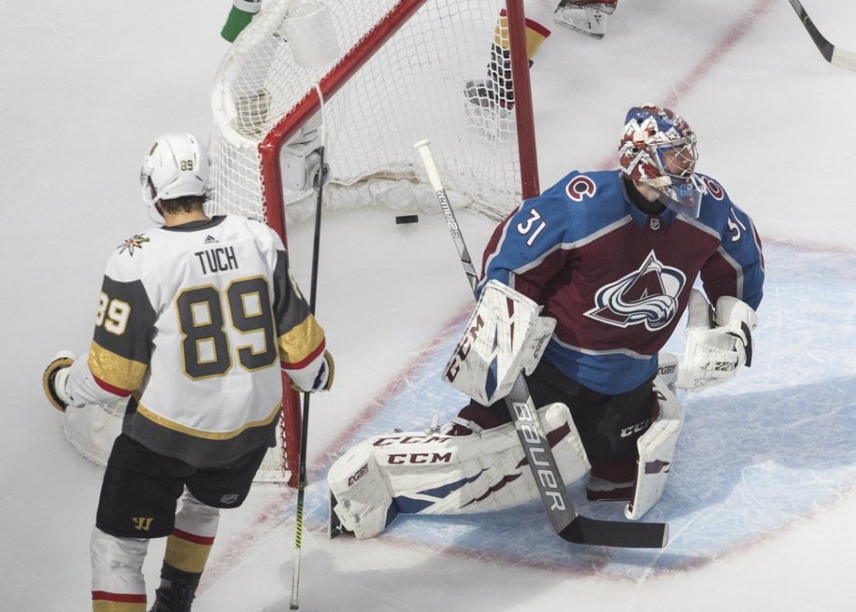 Colorado Avalanche goalie Philipp Grubauer (31) gives up a goal to Vegas Golden Knights’ Alex Tuch (89) during overtime in an NHL hockey playoff game in Edmonton, Alberta, Saturday, Aug. 8, 2020. (Jason Franson/The Canadian Press via AP)