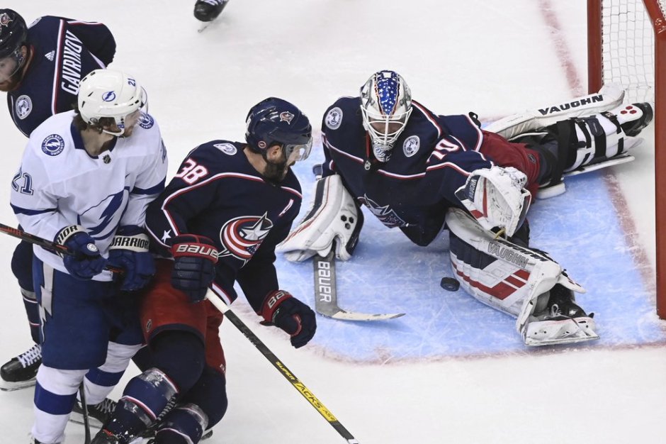 The Columbus Blue Jackets goalie Joonas Karpisalo (70) gets in front of the puck as Tampa Bay Lightning center Brayden Point (21) and the Jackets center Boone Jenner (38) look for the puck in game 3 of the third period Sat Aug 15, 2020 at Scotiabank Arena in Toronto. (Nathan Dennette/Canadian Press via AP)