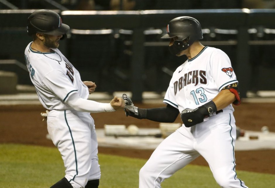 Arizona Diamondbacks’ Christian Walker and Nick Ahmed congratulate each other after Ahmed’s three-run home run against the Oakland Athletics’ during the first inning of a baseball game Tuesday, Aug. 18, 2020, in Phoenix. (AP Photo/Darryl Webb)