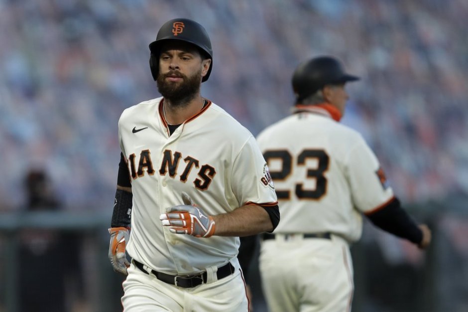 The San Francisco Giants Brandon Belt heads on home after a three run home run in the first inning off of Los Angeles Dodger starter Julio Urias on Tuesday night at Oracle Park in San Francisco. The game wound up going 11 innnings when Donavon Solano hit a two run homer for the gamer. (photo from ap news)
