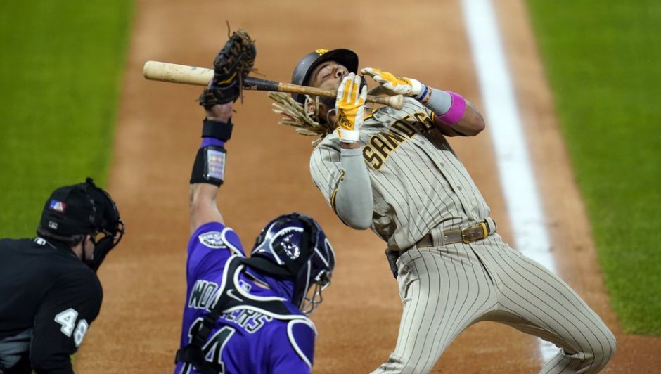 Fernando Tatis Jr of the San Diego Padres dodges a pitch just under his chin from Colorado Rockies pitcher Jeff Hoffman who threw high and tight on Mon Aug 31 at Coors Field in Denver. Tatis and the Padres come to the Oakland Coliseum to play the A’s this Fri Sep 4th (AP News file photo)
