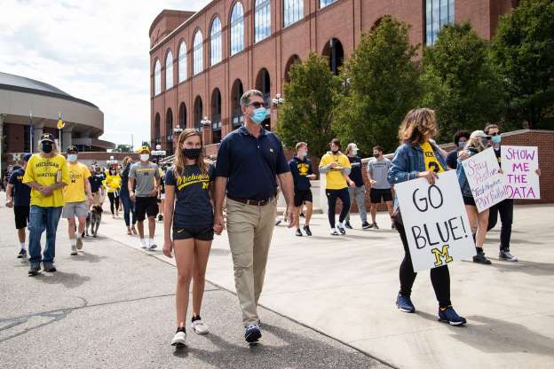 Michigan Wolverines Head Coach Jim Harbaugh holding the hand of daughter Addie at the outside Michigan Stadium with parents, alumni, players and supporters protesting the closure of the Big 10 season for 2020 (Detroit Free Press photo)