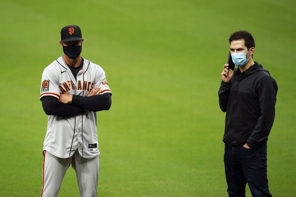San Francisco Giants manager Gabe Kapler (left) and team general manager Scott Harris right gets word that a player on the club had tested positive for Covid-19 and Friday’s game was canceled. They would later learn Saturday’s game was a scratch too. (AP News photo)