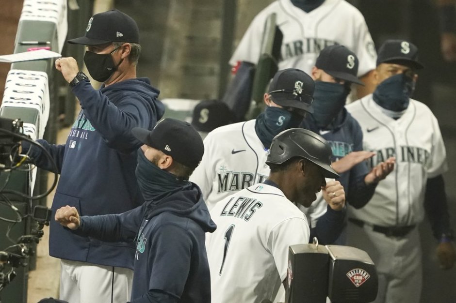 The Seattle Mariners Kyle Lewis is congratulated by teammates after hitting a two run fifth inning home run in the first game of the doubleheader on Mon Sep 14th at T-Mobile Field in Seattle (AP News photo)