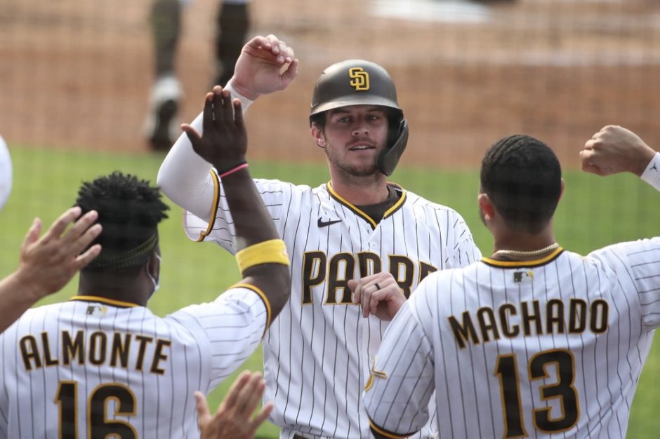 The San Diego Padres Wil Meyers (center) gets in on all the fun with a home run of his own and is greeted by teammates Abraham Almonte (left) and Manny Machado (right) Sunday at Petco Park in San Diego (AP News photo)