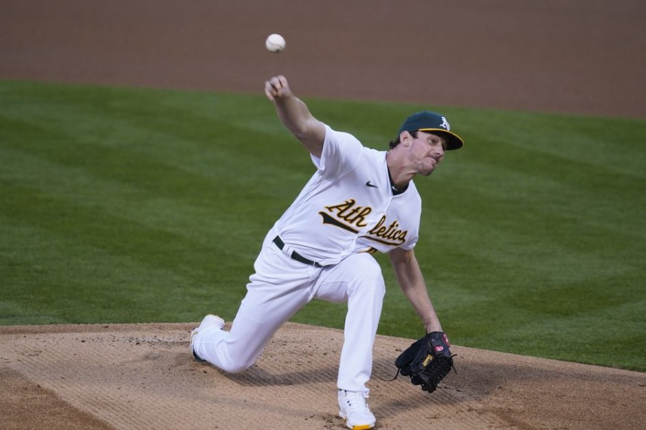 Oakland A’s starter Chris Bassitt who was bringing them all game long is seen here throwing to the San Francisco Giants in the first inning of Friday night’s game at the Oakland Coliseum (AP News photo)