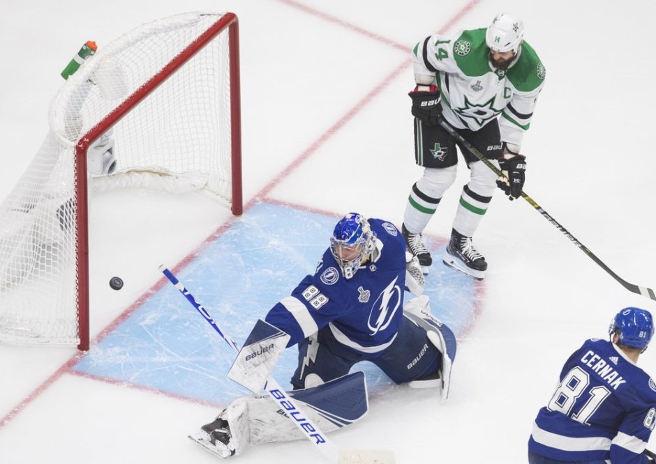 Tampa Bay Lightning goaltender Andrei Vasilevskiy (88) gets a save on a Dallas Stars’ shot the Stars Jamie Benn (14) looks on Sat Sep 19, 2020 at Rogers Centre in Edmonton (AP News photo)