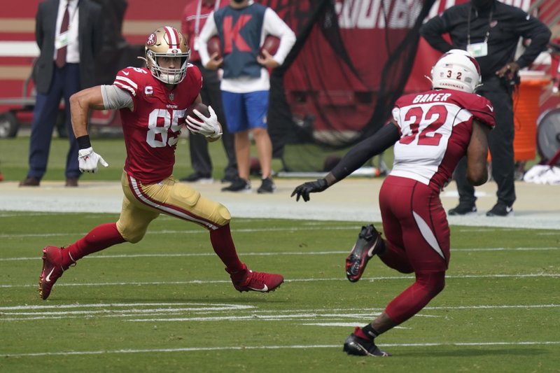 San Francisco 49ers tight end George Kittle (85) on the run against the Arizona Cardinals Bubba Parker (32) during the first half of Sun Sep 13th’s game at Levis Stadium in Santa Clara (AP News photo)