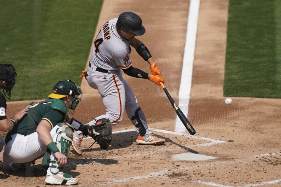 San Francisco Giants hitter Chadwick Tromp goes for the long ball with a two run home run in the third inning with Oakland A’s catcher Sean Murphy behind the plate on Sun Sep 20, 2020 at the Oakland Coliseum (AP News photo)