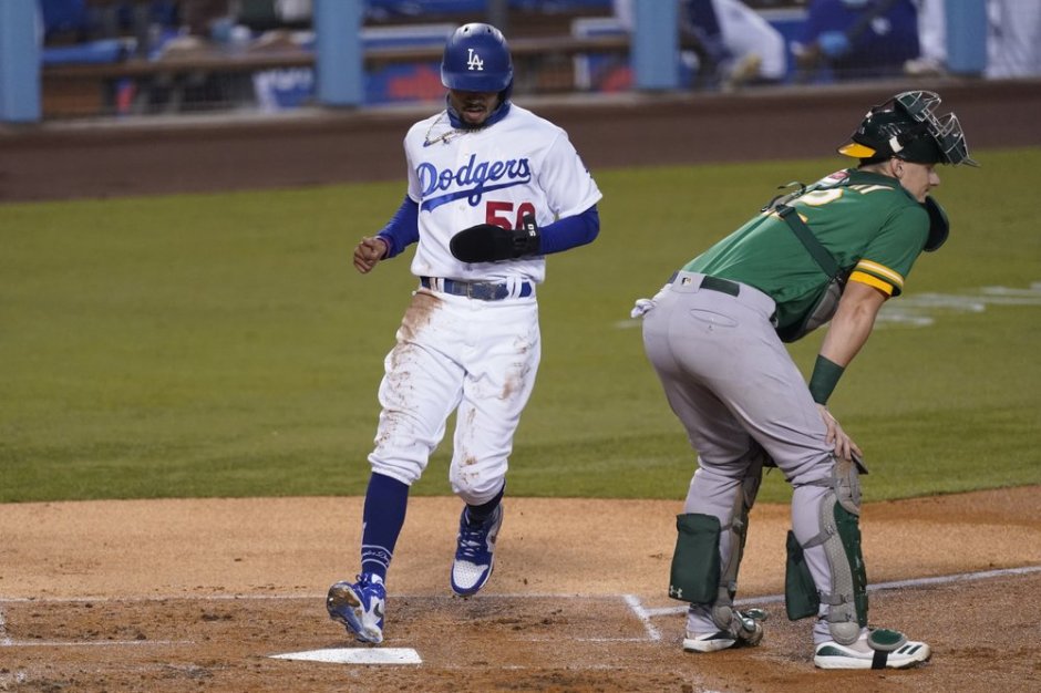 The Los Angeles Dodgers Mookie Betts scores behind Oakland A’s catcher Sean Murphy on a Corey Seager single in the first inning at Dodgers Stadium in Los Angeles on Tue Sep 22, 2020 (AP News photo)