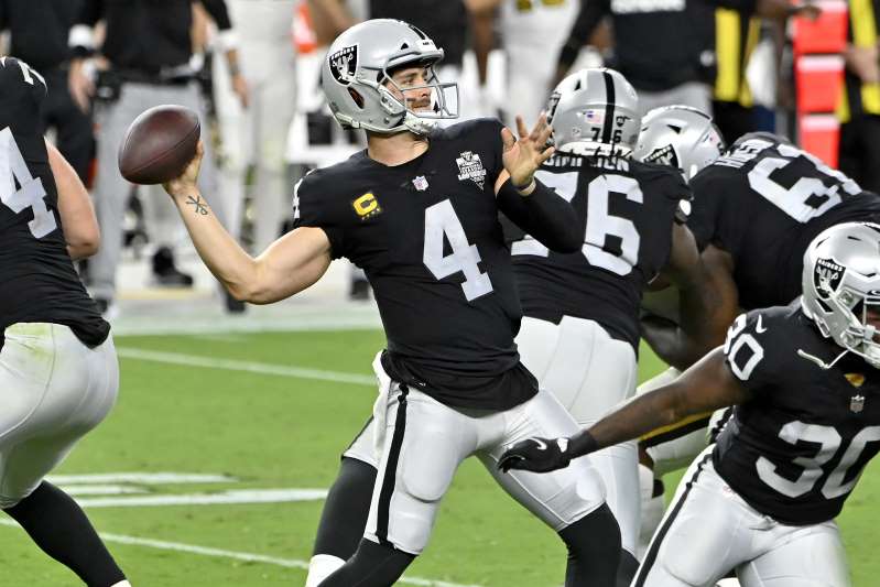 Las Vegas Raiders quarterback Derek Carr hoists one of 28 passes for 282 yards on Monday Night Football in week 2 of the NFL season against the visiting New Orleans Saints at Allegiant Stadium in Las Vegas. The Raiders are in Foxborough for this Sunday’s game against the New England Patriots. (AP News photo)