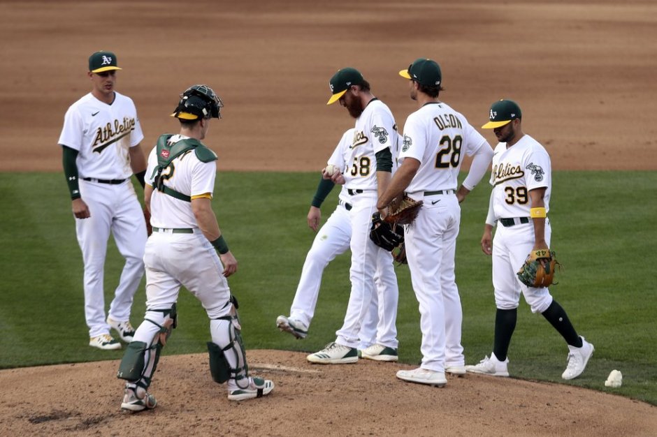 Oakland A’s starter Paul Blackburn (58) is lifted by A’s manager Bob Melvin (not pictured) in the third inning. Blackburn pitched just 2.1 innings giving up five hits and seven runs in the second game of a doubleheader against the Seattle Mariners at the Oakland Coliseum Sat Sep 26, 2020 (AP News photo)