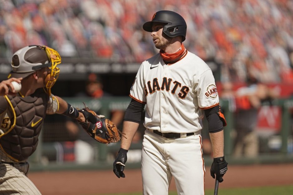 The San Francisco Giants Austin Slater takes looking from a pitch thrown by the San Diego Padres Adrian Morejon in the third inning of Sunday’s game at Oracle Park in San Francisco (AP News photo)