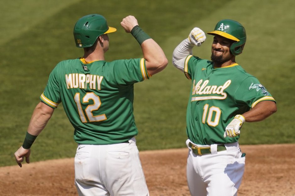 The Oakland A’s Sean Murphy (12) and Marcus Semien (10) go for the forearm bash after Semien went deep for a two run homer in the second inning of game 2 of the ALWCS at the Oakland Coliseum on Wed Sep 30, 2020 (AP News photo)
