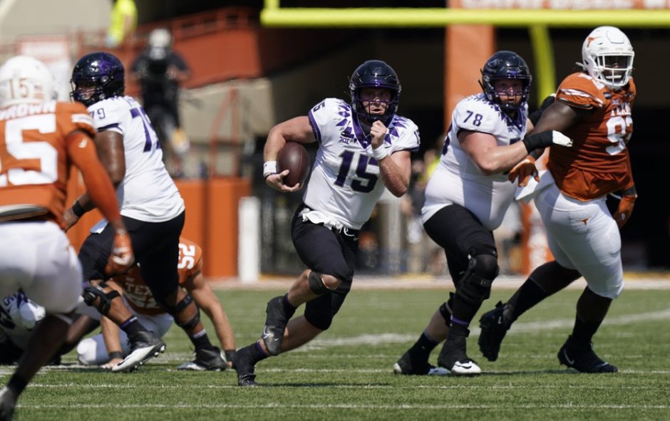 The TCU Horned Frogs quarterback Max Duggan (15) runs a first half keeper against the Texas Long Horns defense in Austin Texas on Sat Oct 3, 2020 (AP News photo)
