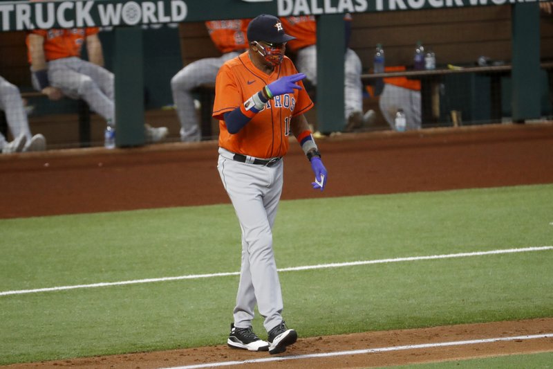 The Houston Astros manager Dusty Baker (12) heads out to pay a visit to the mound in a Sep 27th, 2020 game against the Texas Rangers at Globelife Park in Arlington (AP News photo)