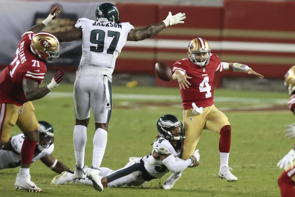 San Francisco 49ers quarterback Nick Mullens (4) in the grasp of Philadelphia Eagles Cre’von LaBlanc forced a fumble which was recovered by the Eagles defensive tackle Malik Jackson (97) on Sun Oct 4, 2020 at Levis Stadium in Santa Clara (AP News photo)