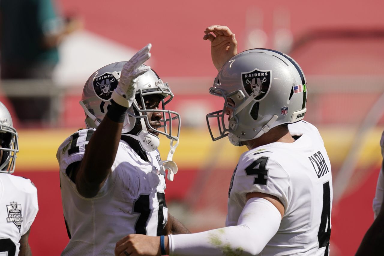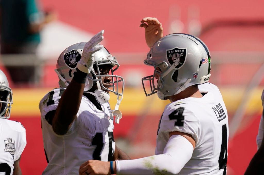 Carr threw for 347 yards and three touchdowns, one each to Henry Ruggs, Nelson Agholor and Darren Waller.