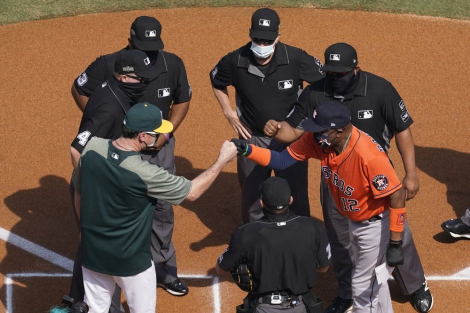 Oakland A’s manager Bob Melvin (left) and Houston Astros manager Dusty Baker (right) meet with the umpires at home plate prior to game 1 of the ALDS Mon Oct 5, 2020 at Dodger Stadium Los Angeles (AP News photo)