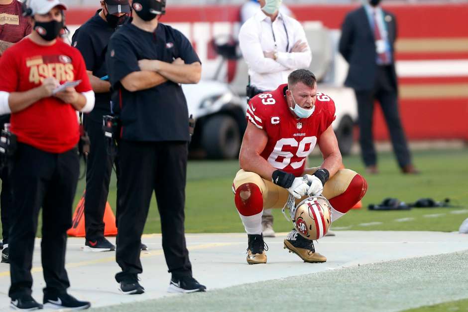 San Francisco 49ers tackle Mike McGlinchey (69) waits on the sideline during their against the Miami Dolphins last Sun Oct 11, 2020 at Levis Stadium in Santa Clara (photo from San Francisco Chronicle)