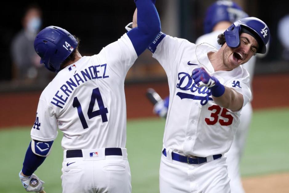 The Los Angeles Dodgers Cody Bellinger (35) suffers the agony of victory after dislocating his right arm on this forearm bash with teammate Keke Hernandez (14) after hitting a home run against the Tampa Bay Rays on Sun Oct 18, 2020 in game 7 of the NLCS at Arlington Stadium in Arlington (yahoo.sports.com photo)