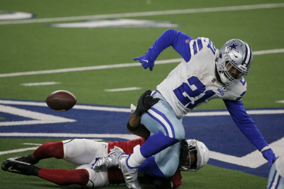 Things have gotten worse for the Dallas Cowboys since quarterback Dak Prescott has left for the season. For example here Cowboys running back Ezekiel Elliott (21) loses the football on a carry as the Arizona Cardinals safety Bubba Baker grabs hold it was Elliott’s second fumble in last Sun Oct 18th’s game in Arlington (AP News photo)