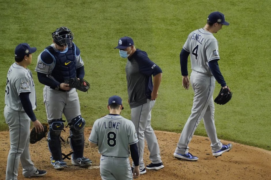 Tampa Bay Rays manager Kevin Cash removes pitcher Blake Snell (4) in the sixth inning of game six on Tue Oct 27, 2020 at Globe Life Park in Arlington vs. the Los Angeles Dodgers (AP News photo)