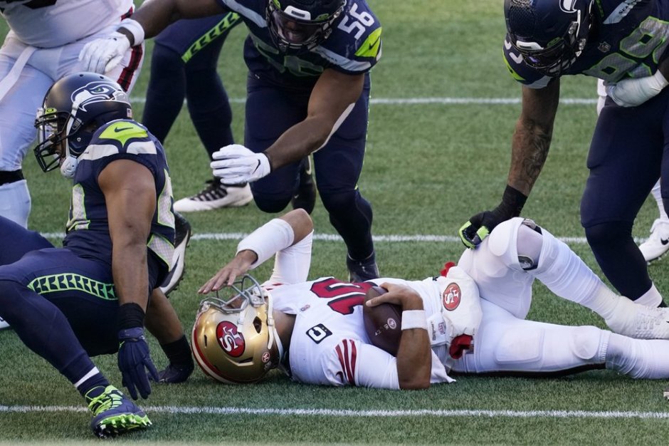 San Francisco 49ers quarterback Jimmy Garoppolo (10) who was sacked on this play by the Seattle Seahawks Bobby Wagner in the first half at Centurylink Field in Seattle on Sun Oct 25, 2020 (AP News photo)