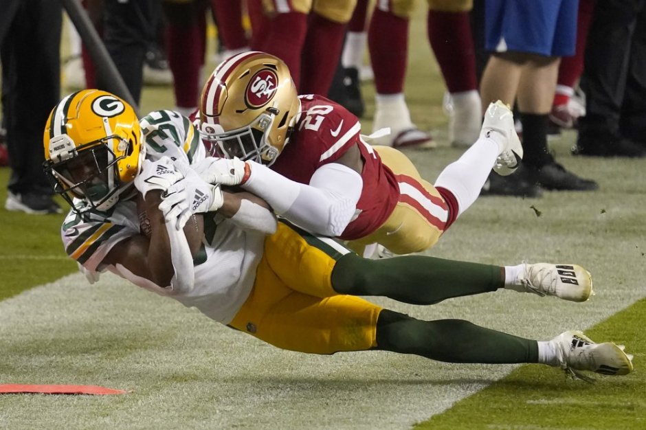 The Green Bay Packers running back Tyler Ervin (32) gets caught from behind in mid air by San Francisco 49ers free safety Jimmie Ward (20) during the first half of Thursday Night Football at Levis Stadium in Santa Clara (AP News Photo)