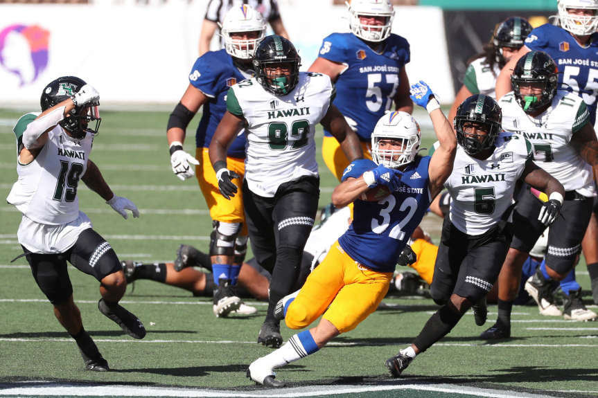 San Jose State running back Kairee Robinson (32) squeezes through the Hawaii defense in the first half of an NCAA college football game Saturday, Dec. 5, 2020, in Honolulu (AP photo)