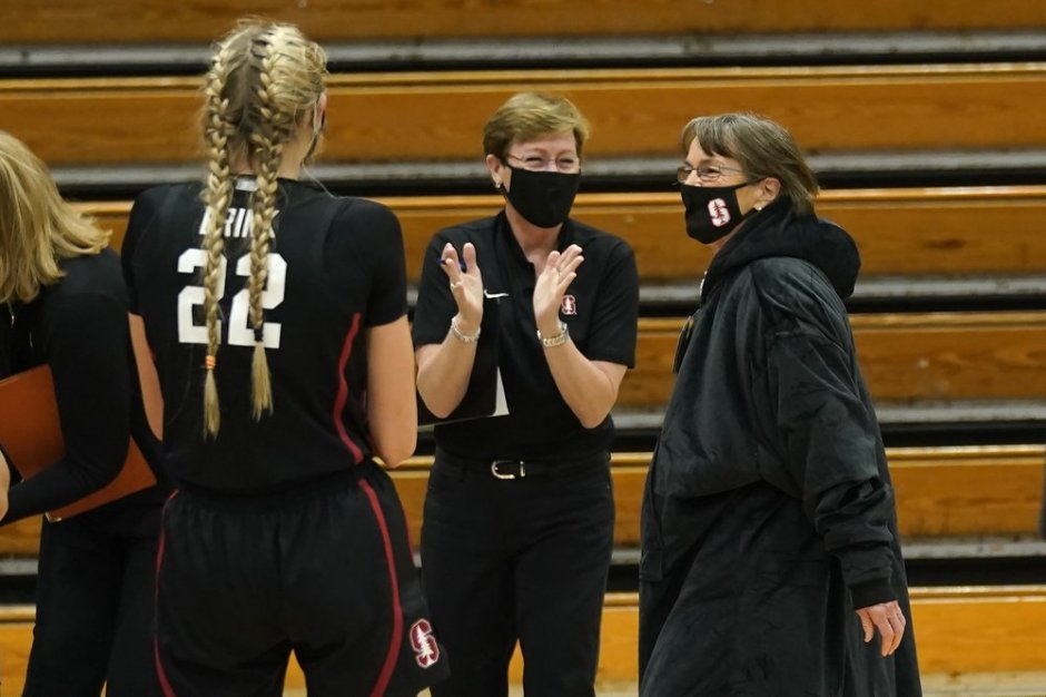 Stanford Cardinal head coach Tara VanDerveer gets congratulations from Stanford’s director of women’s basketball operations Eileen Roche after the Cardinals 106-61 victory against Pacific in Stockton on Tue Dec 15th, 2020. The win makes VanDerveer the all time winningest coach in women’s basketball passing former Tennessee Vols head coach Pat Summitt with 1099 wins (AP News photo)