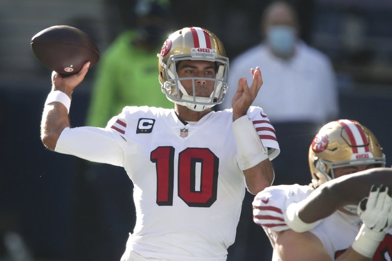 San Francisco 49ers quarterback Jimmy Garoppolo (10) throws against the Seattle Seahawks defense back on Nov 1, 2020 at Lumen Field in Seattle. This would be Garoppolo’s last game of the season after suffering a high ankle injury (AP News photo)