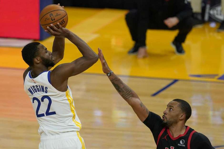 The Golden State Warriors forward Andrew Wiggins (22) led the Warriors in scoring takes a shot against the Toronto Raptors guard Norman Powell (right) on Sun Jan 10, 2021 at Chase Center in San Francisco (AP News photo)