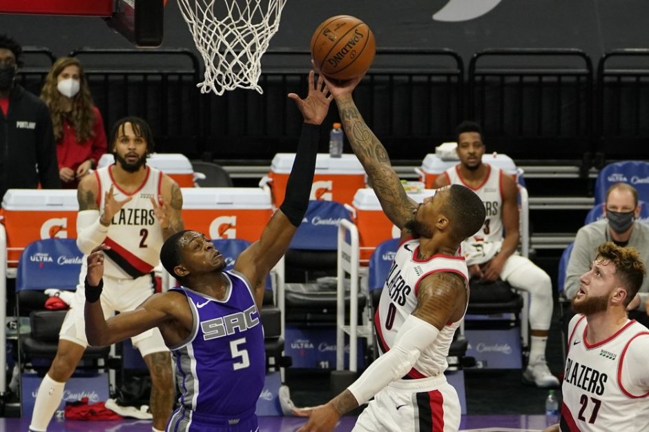 The Sacramento Kings De’Aaron Fox (5) goes up against the Portland Trailblazers Damian Lilliard (0) at Golden One Center in Sacramento on Wed Jan 13, 2021 (AP News photo)