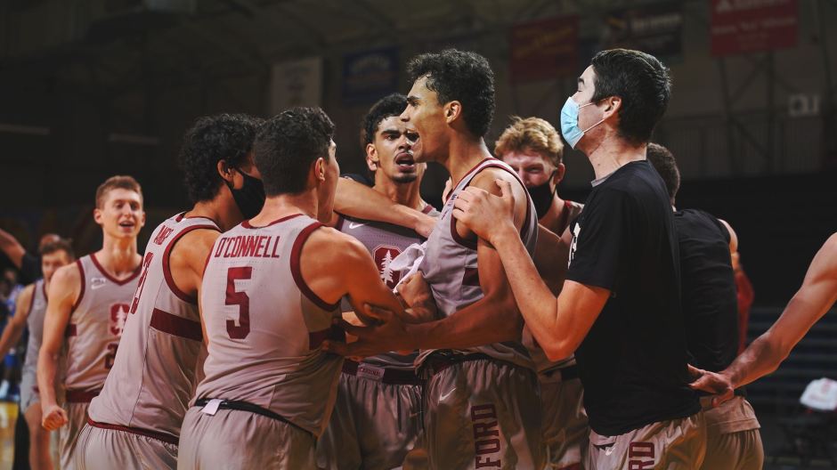The Stanford Cardinal’s Oscar da Silva (13) gets the warm reception after scoring a buzzer beater to defeat the visiting UCLA Bruins at Kaiser Permanente Arena in Santa Cruz on Sat Jan 23, 2021 (gostanford.com photo)