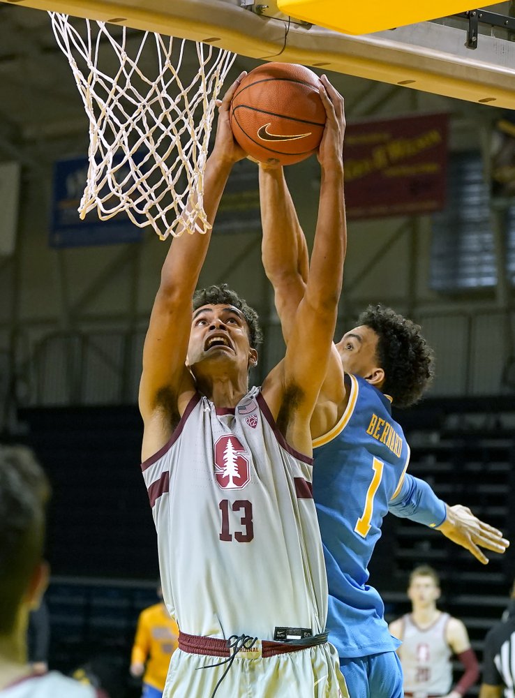 The Stanford Cardinal Oscar da Silva (13) gets to the basket ahead of UCLA’s Jules Bernard (1) on Sat Jan 23, 2021 at Kaiser Permanente Arena in Santa Cruz (AP News photo)