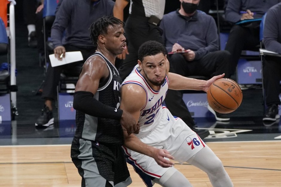 Philadelphia 76er guard Ben Simmons (right) tests out the defensive skills of the Sacramento Kings guard Buddy Hield (left) in the first half at Golden One Center in Sacramento on Tue Feb 9, 2021 (AP News photo)